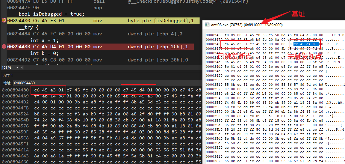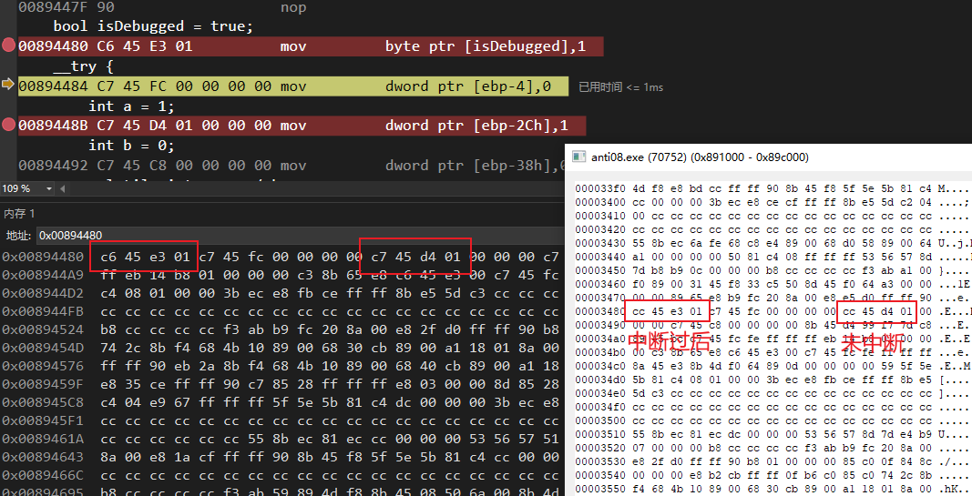 软件断点的本质是,在进行调试时候下的断点,断点指令的第一个字节被替换成为了 0xcc,也就是汇编 int 3 指令