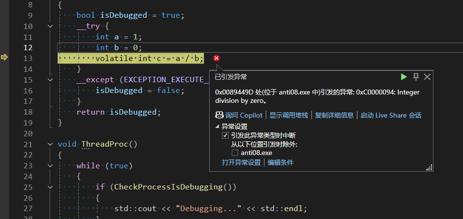 在 vs2022 中,如果勾选了除零异常(在 “调试” -> “窗口” -> “异常设置” 中),调试的时候就会中断在异常位置,F5 会继续执行,调试器并不会处理该异常