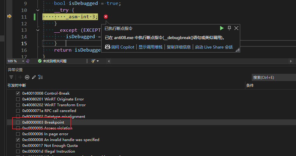 但是在 vs2022 调试器对 int 3 做了特殊处理,发现 int 3 的时候,始终会中断程序,无视你的异常设置