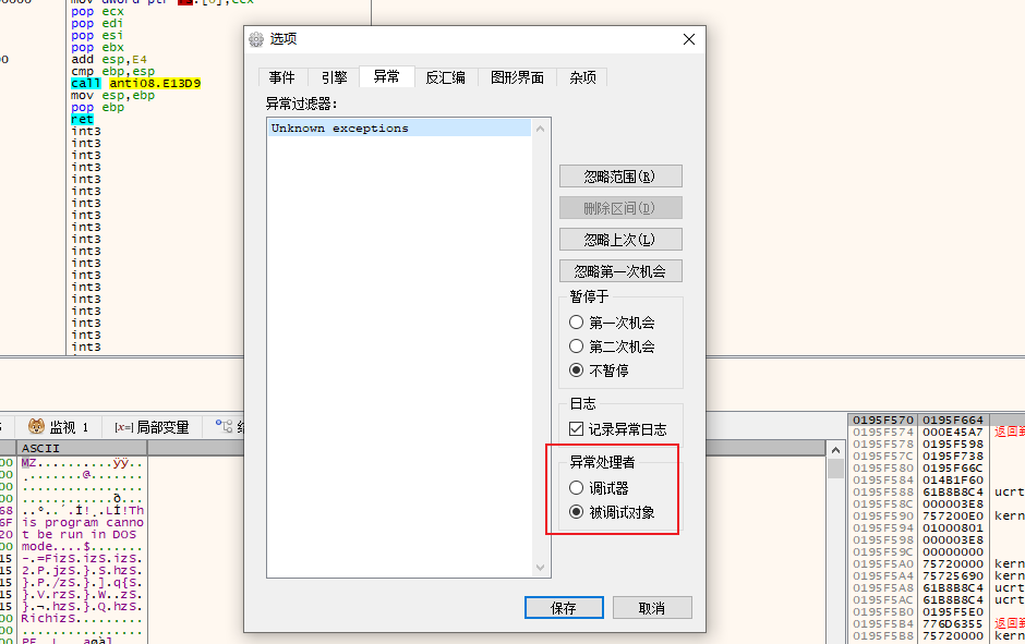 鉴于 int 3 这些异常处理的反调试太过于基础,x32dbg/x64dbg 已经对这些反调进行了免疫,只需要将异常处理者设为 “被调试程序”,那么所以异常统统都不处理