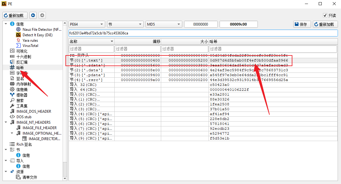 获取执行文件 .text 代码段的 hash 值可以使用 DIE 中计算的哈希进行右键复制,也可以使用 python 代码进行计算