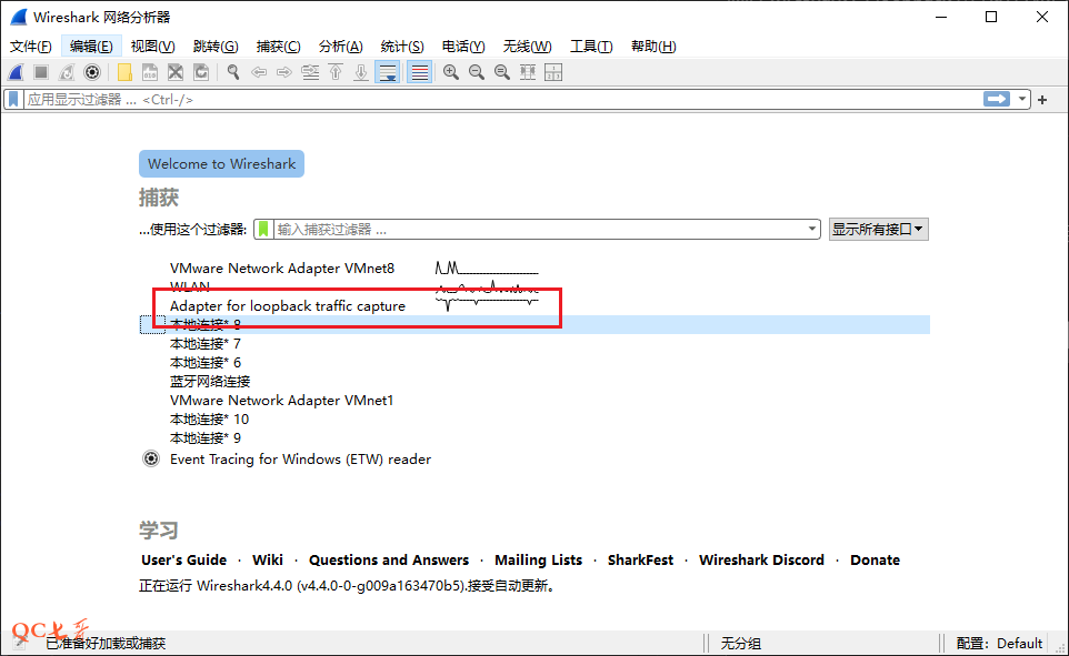 启动 wireshark 软件,在启动页面选择 lookback 网卡进行抓包