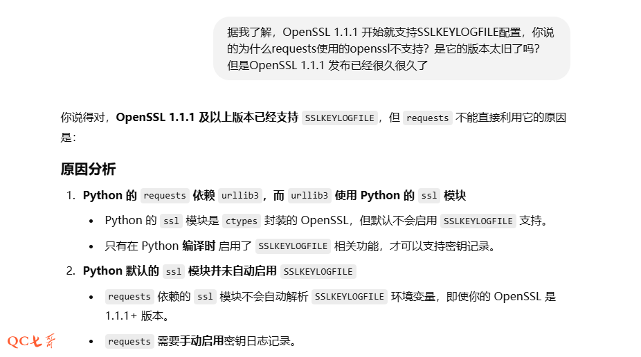 通过 chatgpt 的回复了解到,是 requests 底层的封装库就没有启用对 SSLKEYLOGFILE 的支持