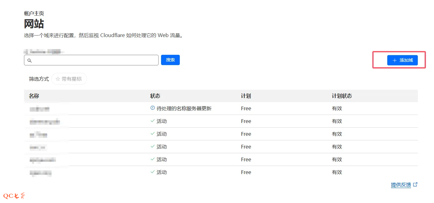 登录 cf 后,在首页的右侧位置,有一个 “添加域” 按钮,点击然后输入你自己的域名