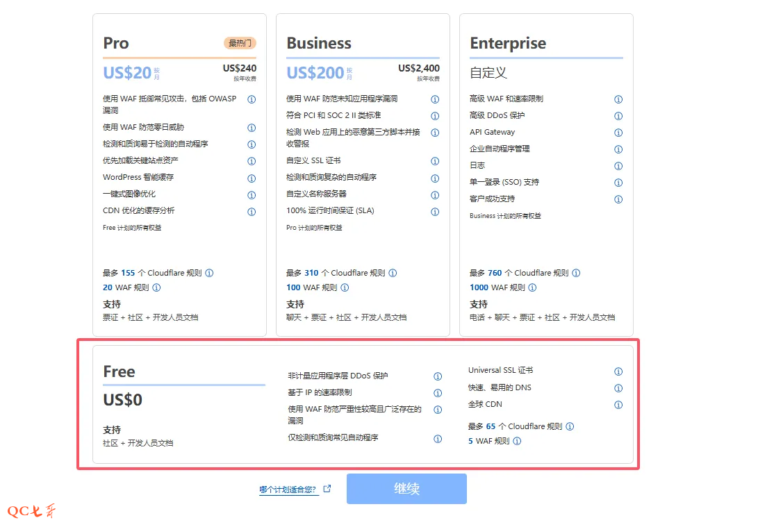 然后为自己的选择一个计划,这里选择免费的就行