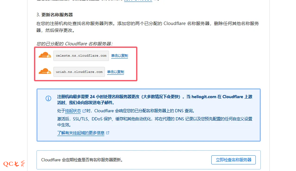 这里会出现两条 cf 的名称服务器地址,一会要在域名服务提供商中配置