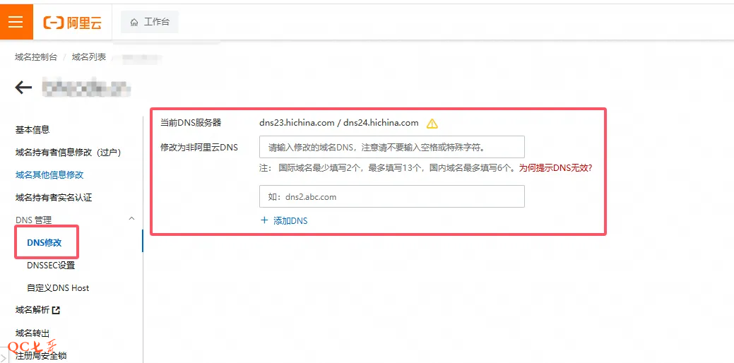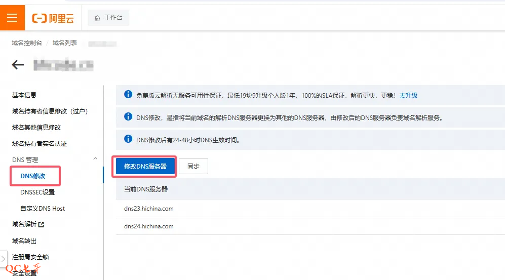 登录阿里云,选择需要修改的域名,在 “DNS修改” 页面中,将上面两条 cf 的地址添加到这里来