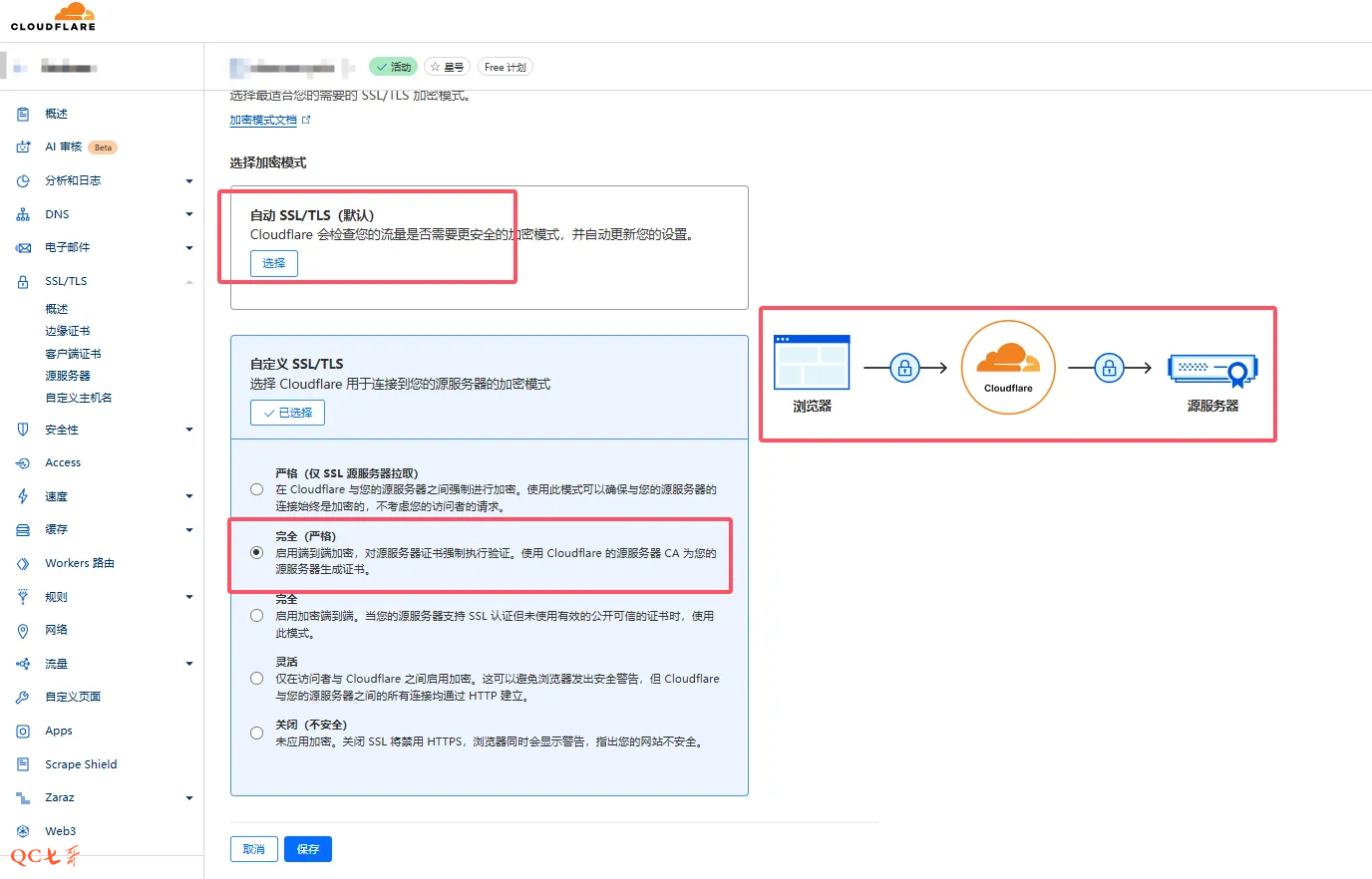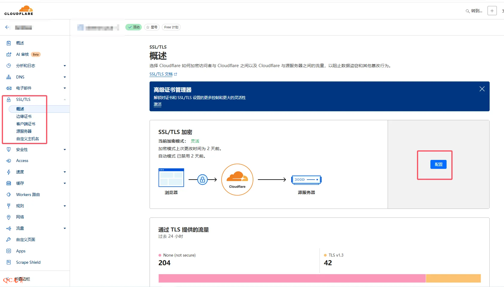 在 cf 的页面中,选择 “SSL/TLS”,然后点击右边的 “配置”
