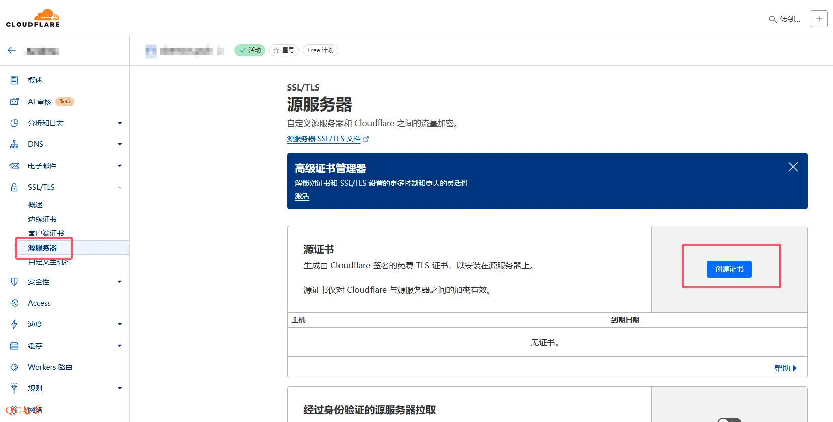 选择 “源服务器” 菜单点击,右侧点击 “创建证书”