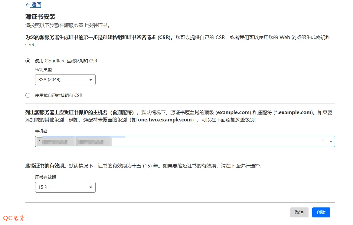 在源证书安装页面,保持默认的配置就行,这里生成的是通配证书,有效期为15年长的证书