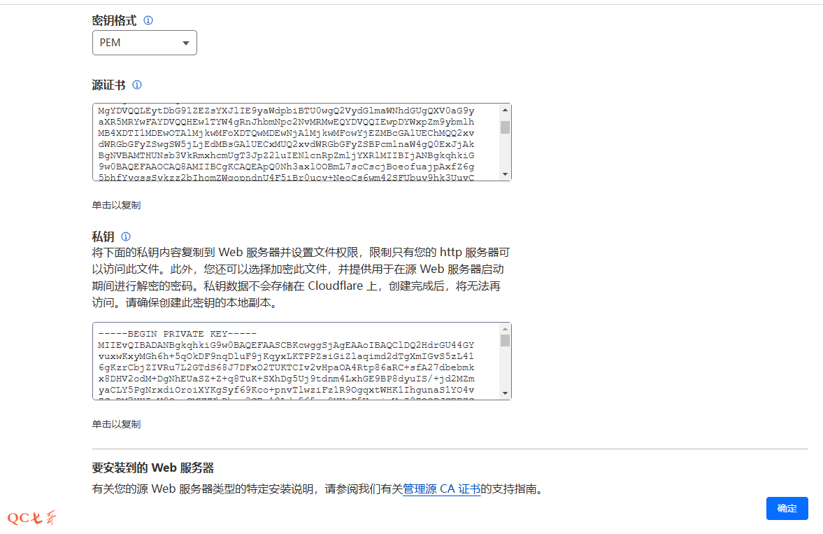 点击创建后,生成了一个源证书和私钥,这里将它们复制下来,然后点击确定