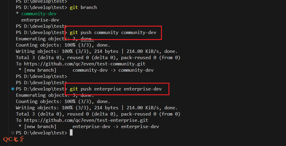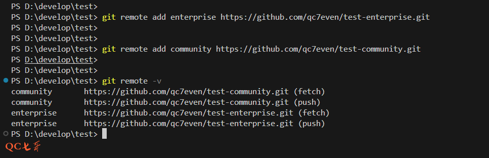 如 community 指示的是远端仓库 https://github.com/qc7even/test-community.git,community-dev 是分支名