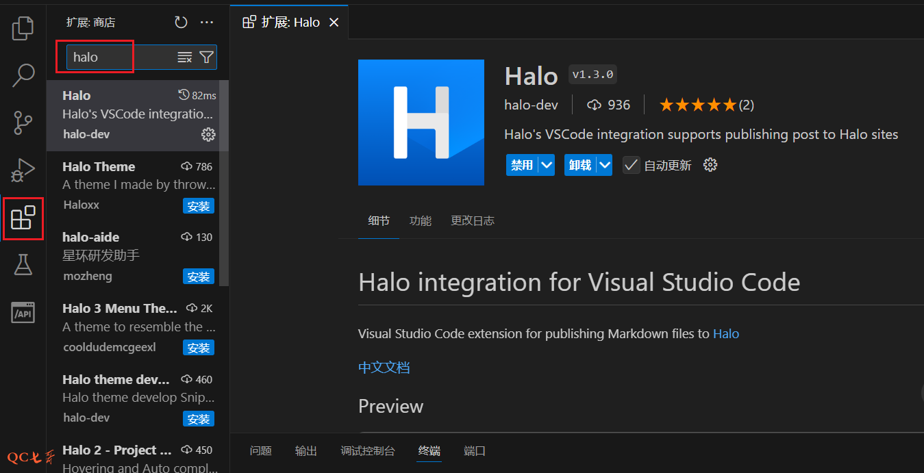 在 vscode 的插件中心,直接搜索 halo ,进行插件安装