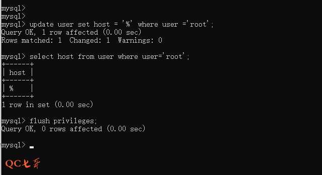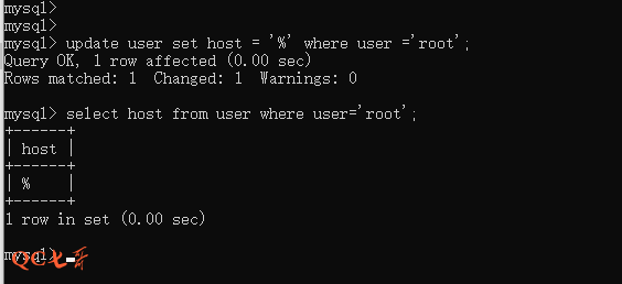 修改为 % 表示允许外部主机连接当前 mysql,修改后查看修改结果