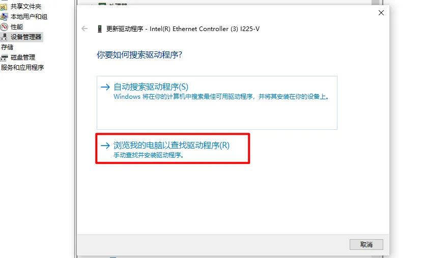 下载后解压出来,在设备管理器中进行安装驱动,选中网络适配器 Intel(R) Ethernet Controller (3) I225-V 然后右键 “更新驱动程序”