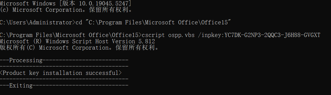 密钥安装成功后,分别执行下面的命令,分别是:设置 KMS 服务器,激活 office2013,查看 office2013 激活状态