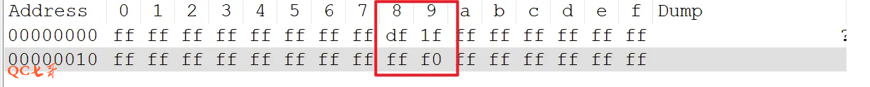 其中 08 单元的 df 在图形上表示为左侧第一个有值的列,从上往下依次为低位到高位,写成二进制为 11011111