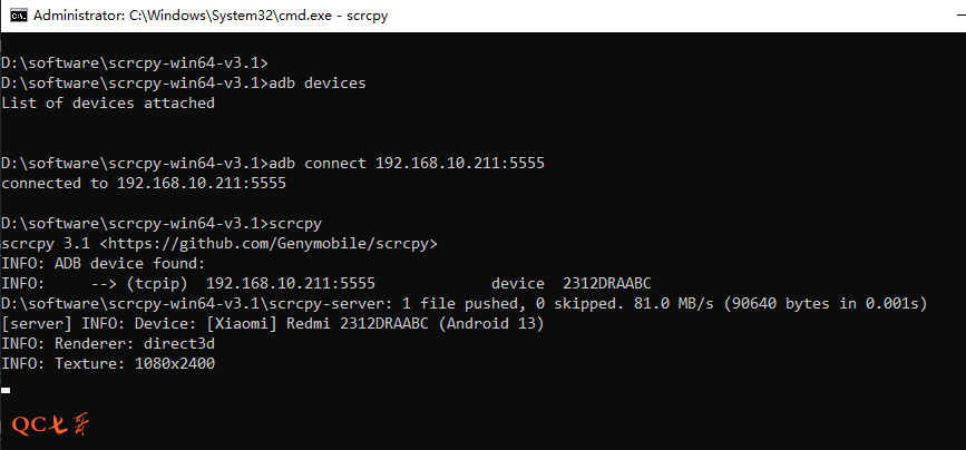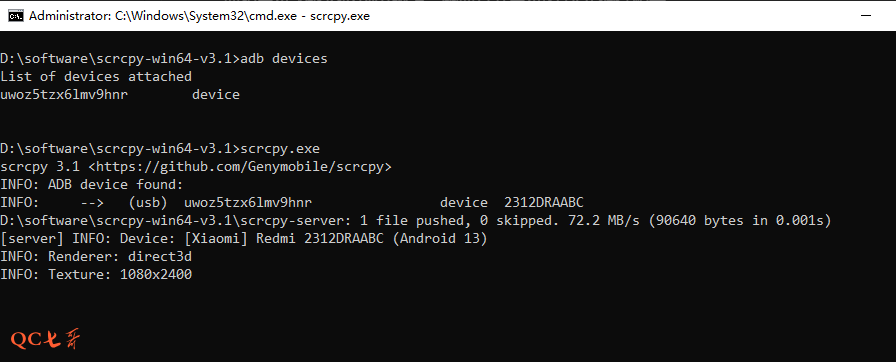 通过 scrcpy 命令开启手机投屏,默认会连接列表显示的第一台设备