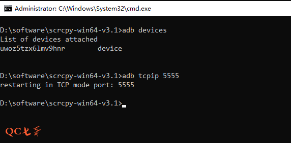 这个命令的意思是通过 USB 调试,在手机上开启一个 tcp 监听 5555