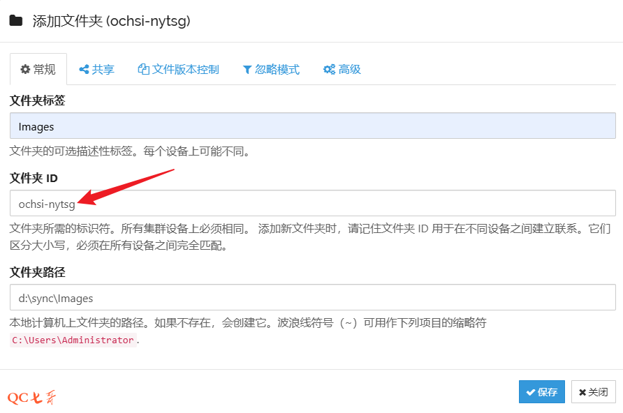 这里的 “文件夹ID” 很重要,源和目的的这个 ID 值要一致才可以进行文件同步,将 “文件夹ID” 拷贝下来,一会配置目的的时候填上