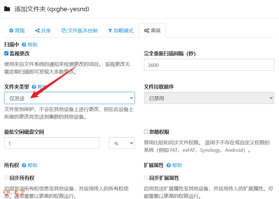 高级中设置文件夹类型,如果是单向同步的话源选择 “仅发送”,目的节点选择 “仅接收”,按需要配置