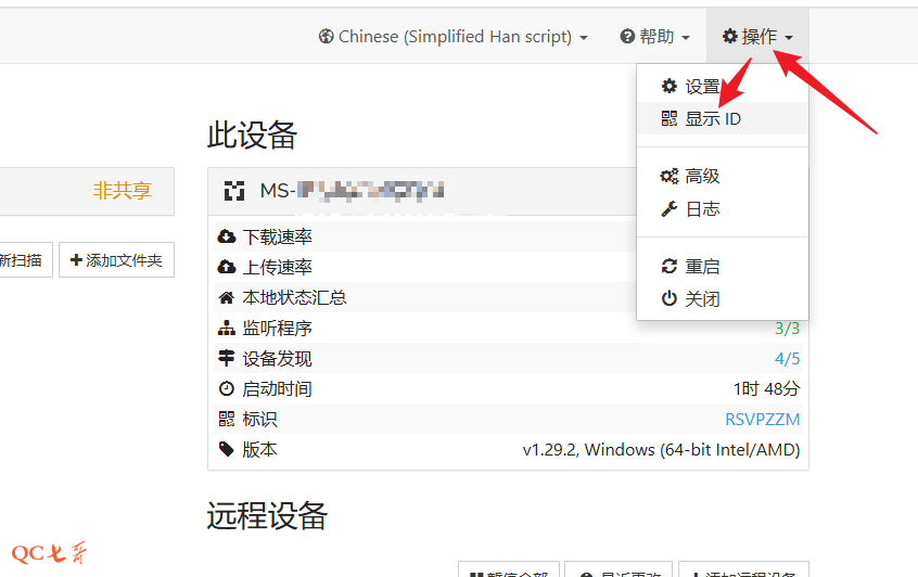 如果这里不能识别出来,可以通过 ID 方式进行添加,在另一台设备的 web 页面上,点击 “操作” -> “显示ID”