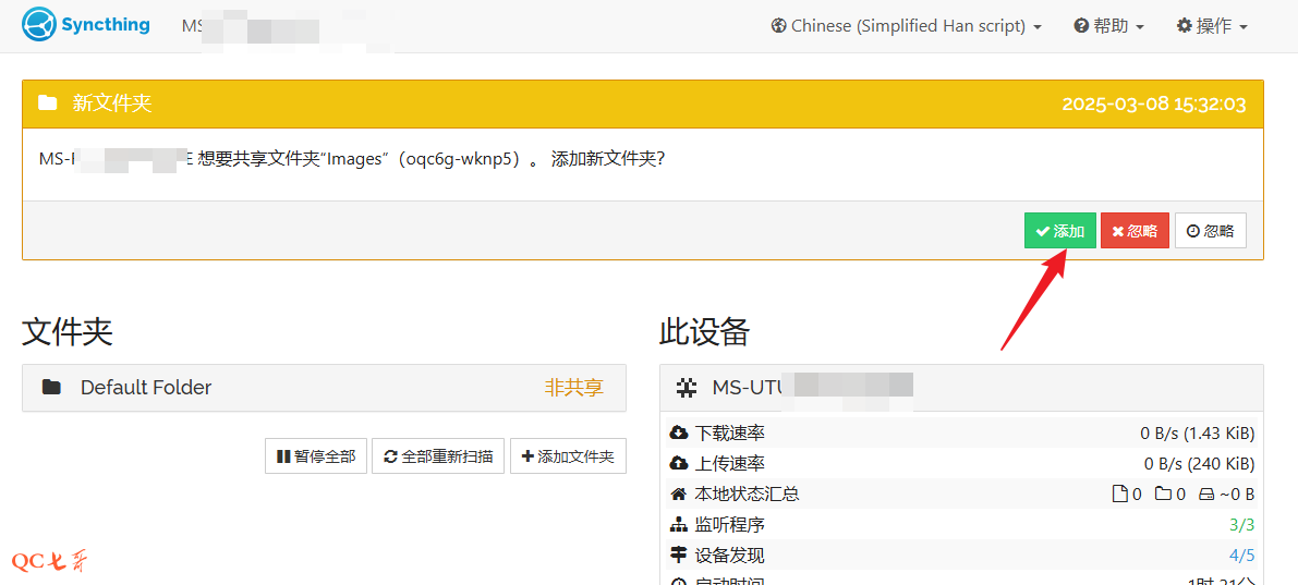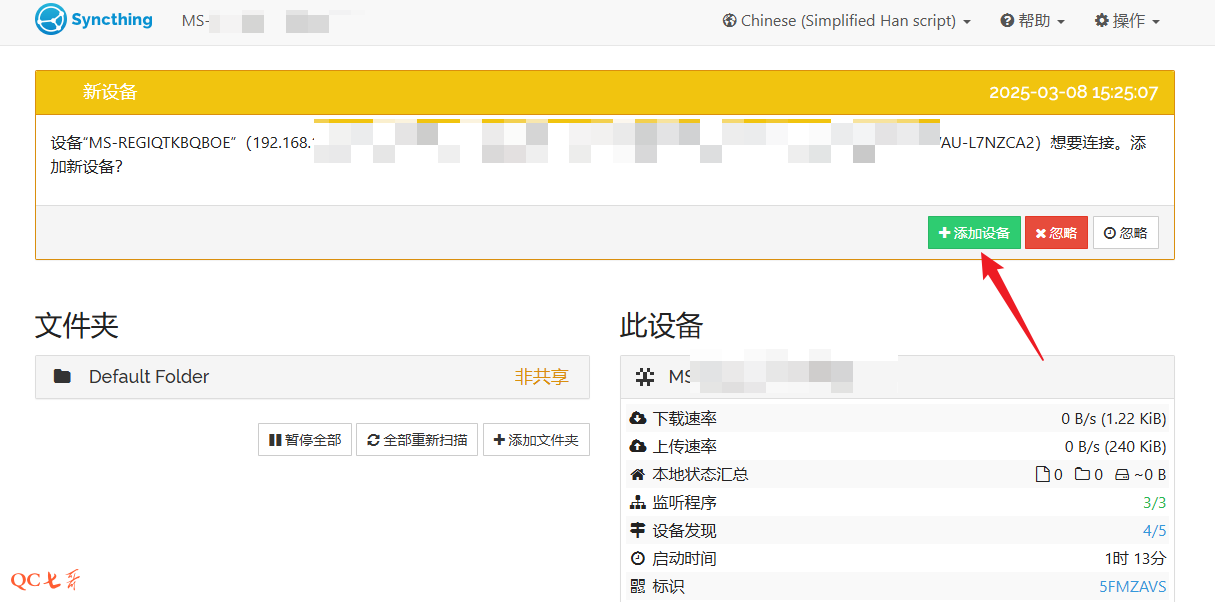 点击添加后,在另外一台设备上会弹出一个提示,需要同意点击 “添加设备”