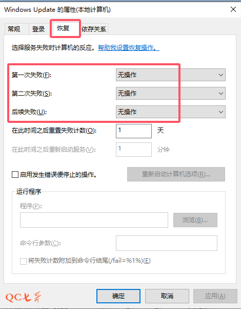 在恢复标签页中,将失败的后续操作设置为 “无操作”