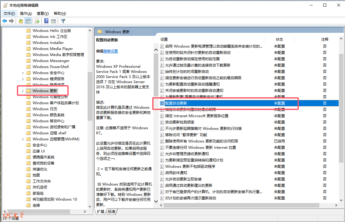 依次单击左边的菜单 “计算机配置” -> “管理模板” -> “Windows组件” -> “Windows更新”