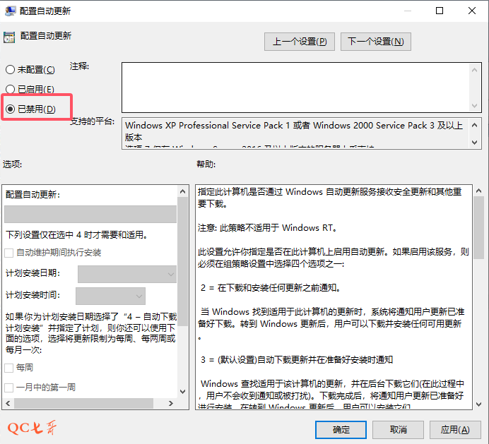然后在右边找到 “配置自动更新” ,双击打开配置窗口,设置为 “已禁用” 然后确定