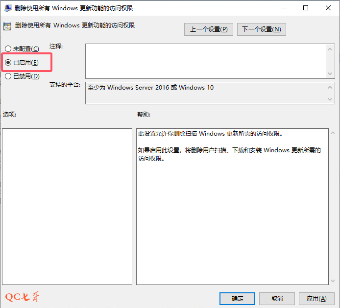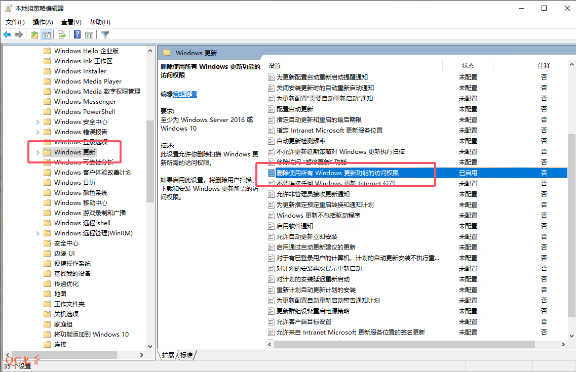 在下方找到 “删除使用所有 Windows 更新功能的访问权限”,双击打开配置窗口,设置为 “已启用” 然后确定