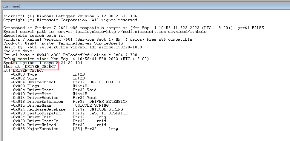 重新启动 windbg ,使用 dt _DRIVER_OBJECT 查看符号信息,显示结果如下