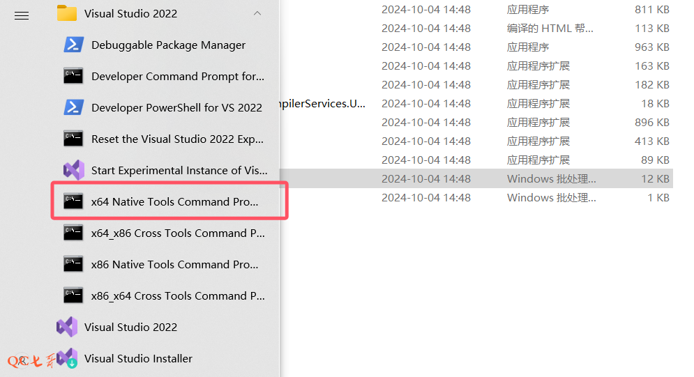 在系统的开始菜单中,找到 Visual Studio 2022 下的 x64 Native Tools Command Prompt for vs 2022 点击运行
