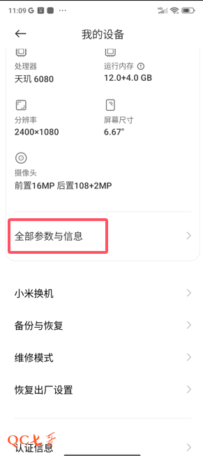 打开 “设置”,点击 “我的设备”, 下滑点击 “全部参数与信息”