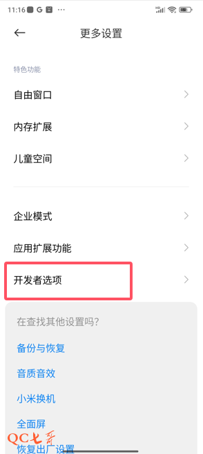 回到 “设置” 页面,往下拉打开 “更多设置”,往下拉看到 “开发者选项”