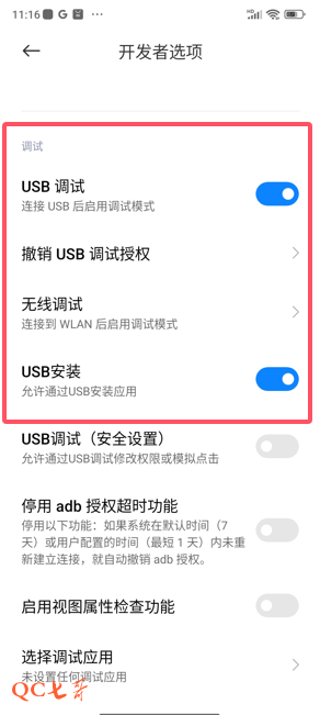 进入开发者选项后,在当前页面往下拉,在调试下打开 “USB调试” 配置项